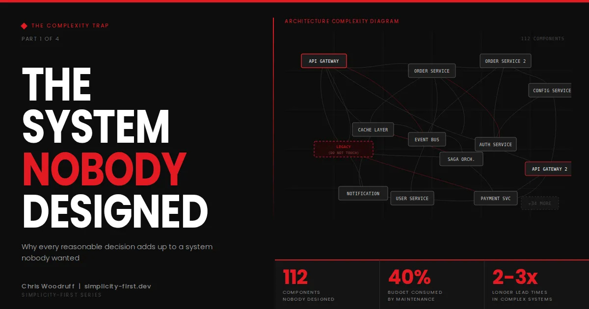 The collective result consumed 40% of the engineering budget on maintenance, shipped features in weeks that should take days, and produced 2-3x longer delivery times than simpler systems doing the same job.